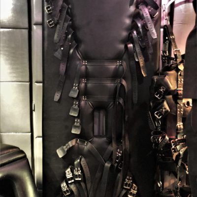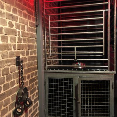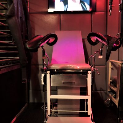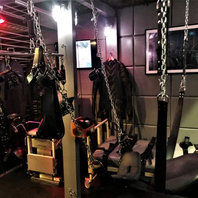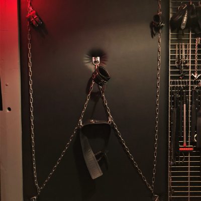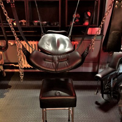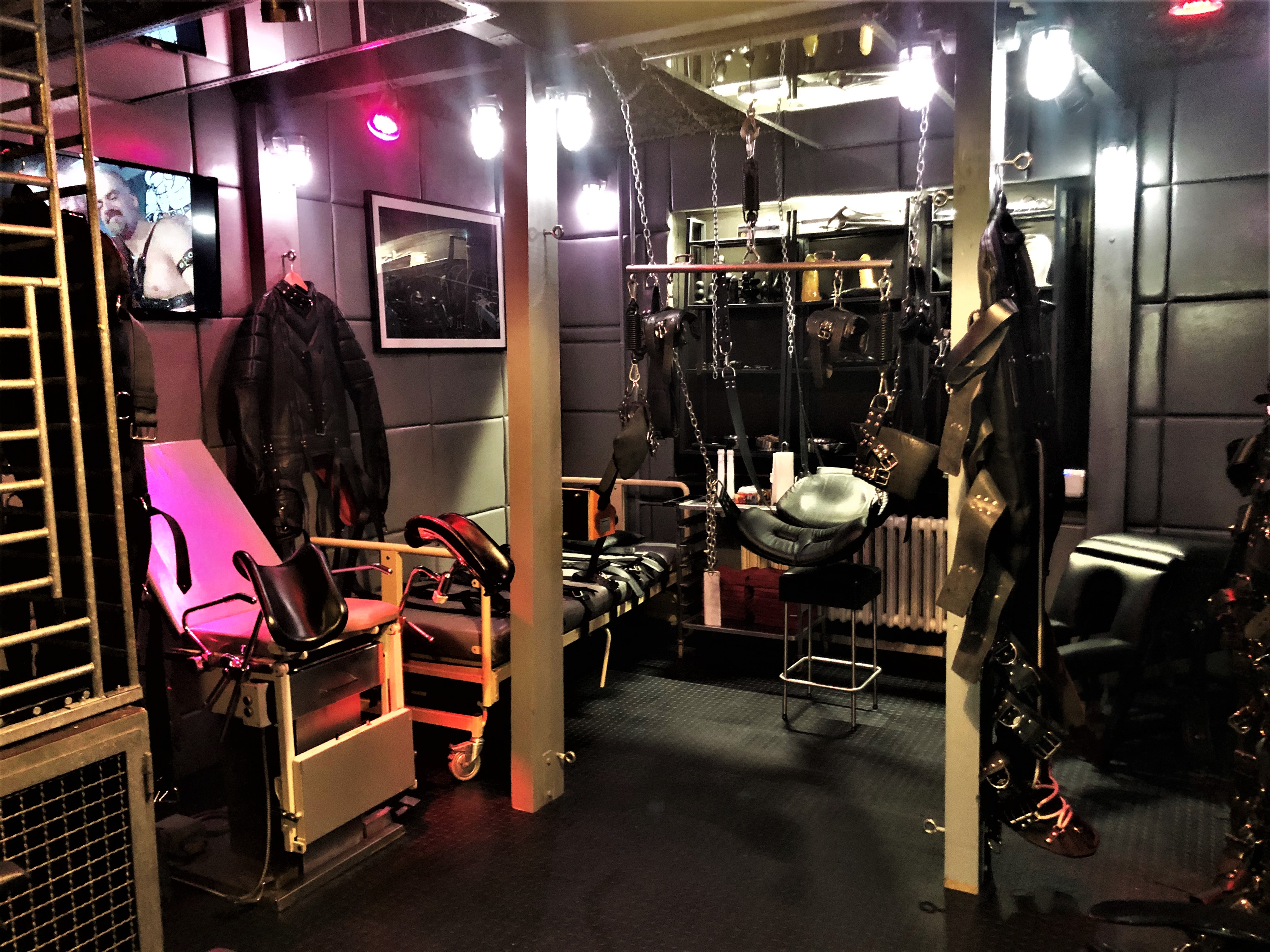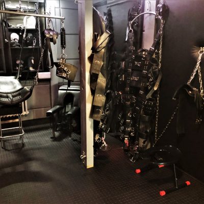 Mit seinen 20 qm ist der Playroom fast so groß wie anderswo die Hotelzimmer oder das ganze Apartment. Zur selbstverständlichen Ausstattung gehören der gepolsterter Luxussling von Blackjump mit großem Spiegel darüber, der große Käfig, die Hundebox darunter, eine Bondagewand als Andreaskreuz, das Bondagebett (auch nutzbar als zusätzlicher möglicher Schlafplatz für einen weiteren Gast), ein Bondagechair, ein Spankbock zum Festschnallen ebenso wie Musikanlage und Fernseher mit einer Auswahl an Pornos. Highlight ist sicher der elektrisch betriebene Gynstuhl mit Verstellmöglichkeiten nach oben, unten und in der Neigung des Sitzes sowie Spiegel darüber. Diverse Spielsachen wie Dildos, vielerlei Kleinteile und Bondagegear stehen ohne Extrakosten zur Verfügung. Die Beleuchtung des Playrooms kann individuell in Farbe und Intensität eingestellt werden, ebenso die Beleuchtung im Schlafzimmer und in der Zelle.